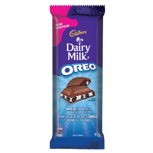 Milk and Oreo cookies, what on earth could be better? The Dairy Milk Chocolate Bars Oreo! Delicious Oreo cookie bits combined with the smooth richness of Dairy Milk Chocolate, which as we know is already made with fresh milk. So you can skip the glass of milk with these Oreo's. These Canadian Chocolate Bars have every yummy base covered! Cream-filled Oreo cookie bits embedded in Dairy milk chocolate, it's just plain dreamy!
